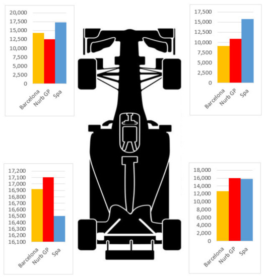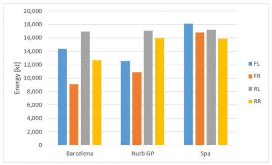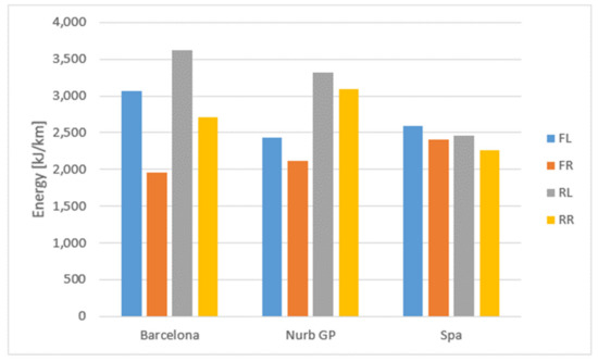 The sensitivity analysis to different tracks highlights quite well how the track layout itself impacts each tire. For example, on Nürburgring GP, the rear tires are more stressed than the front ones because of the many accelerations from slow speed needed to exit tight corners, while on Barcelona, the left tires are more stressed because of the many right-hander fast corners, some of them also requiring combined longitudinal and lateral energy. The energy of Spa looks on the other hand more balanced over the four tires with the overall energy level higher than the other two tracks. However, this is not true if we consider the energy per kilometer shown in