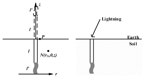 Generally, the common grounding device of transmission line towers consists of horizontal or vertical ground electrodes [22,23,24]. Taking the vertical electrode structure as an example, the process of soil dispersion is analyzed theoretically. In Figure 1, the radius of the ground electrode is r0, the length is l, and it is buried in the ground vertically. The soil resistivity is ρ, and the soil discharge area is a slender cylindrical channel with a bottom radius of r’, a length of l’, and a current of I, which flows into the medium through the rod. In this paper, a mirror electrode and discharge region with a length of (l + l’) are assumed under the ground by means of mirroring, and the semi-infinite space in the calculation of the current field is transformed into infinite space.