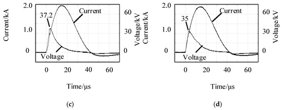Current and voltage waveform of soil with the same resistivity and different water content: (a) The moisture is 23.56%; (b) moisture is 39.14%; (c) moisture is 40.50%; (d) moisture is 48.80%.