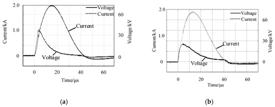 Current and voltage waveform of soil of different soil resistivity when injected into impulse current: (a) ρ = 300 Ω·m; (b) 700 Ω·m.