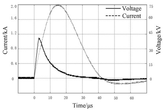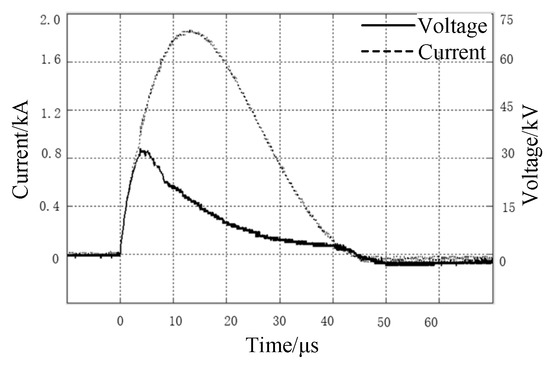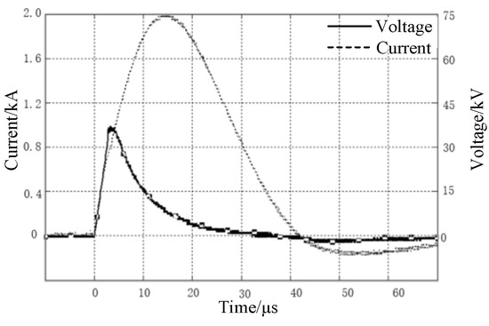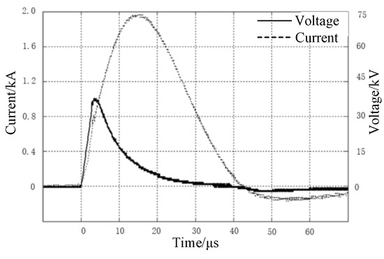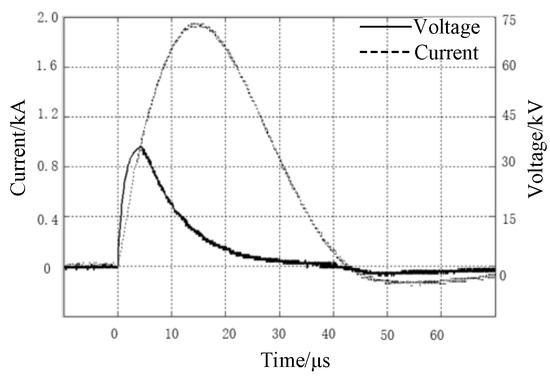 Current and voltage waveform of modified soil with the water content of 25% when injected into the impulse current.