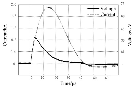 Current and voltage waveform of modified soil with the water content of 15% when injected into the impulse current.