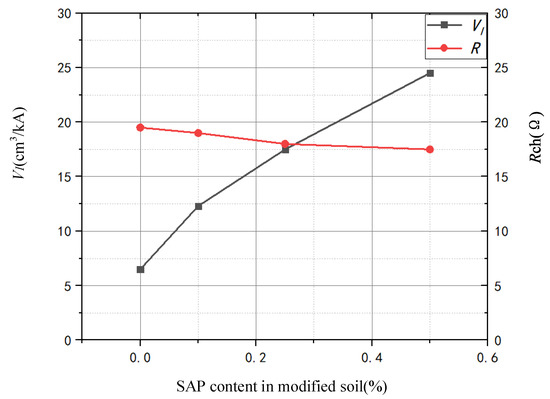 - With the increase in the content of SAP, the VI of the discharge zone of the soil increased gradually. When the content of the modified material was 0.5%, the VI’s value of the dispersion zone of the soil modified by SAP was 24.59 cm3/kA. Compared with the modified soil without SAP, the impulse grounding resistance decreased by 10.26%, and the value of VI increased by 3.54 times.
