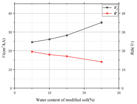 As can be seen from Figure 23, with the change of water content in the modified soil, the value of VI in the spark discharge area in the modified soil increases, and the value of impulse grounding resistance of the grounding electrode gradually decreases, indicating that the dispersion performance of the modified soil is also continuously enhanced. In addition, when the moisture content of the modified soil was 25%, VI was 20.10 A/cm3, which decreased by about 55.47% compared with that of 5%. This indicates that modified soil with higher moisture brings a discharge process with greater intensity and a better dispersion capacity of the impulse current. This is because SAP absorbs sufficient water in the modified soil, and a large number of water molecules fill the air gap between the soil particles, which reduces the resistivity of the modified soil near the grounding electrode. At the same time, with the increase in moisture in the soil, water film appears on the contact surface between the grounding conductor and the soil, which reduces the contact resistance, and the soil discharge process becomes more intense, which is macroscopically represented by the increase in the volume of the soil discharge area.