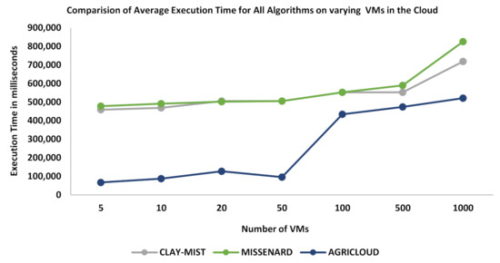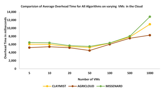 The developed algorithm AGRICLOUD is compared with CLAYMIST (cloud enabled CMM index for smart agriculture monitoring system) [36] and MISSENARD [37] baselines in terms of execution time, throughput time, and overhead time. In the first case, execution time is demonstrated for all algorithms in Figure 2. The number of tasks in the form of audio, video, images, texts, and maps is executed gradually over 5, 10, 20, 50, 100, 500, and 1000 VMs. It can be observed that, from the very start, AGRICLOUD remains very stable in processing the tasks. However, at 100 and more VMs, more execution time is required, showing less performance, but its performance is still better than CLAYMIST and MISENARD. These two algorithms performed somehow equal to 500 VMs but gradually started to require more execution time, rendering them the worse choice. This shows that the proposed algorithm has better classification performance and scalability than others.