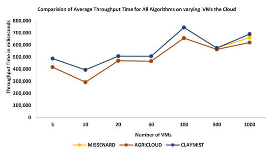 Figure 3 shows throughput time taken by the baselines over 5, 10, 20, 50, 100, 500, and 1000 VMs. It is clear that all algorithms start better at the beginning and gradually increase their time when several tasks and VMs increases. At the end of the last simulation over 1000 VMs, AGRICLOUD performed comparatively better than MISSENARD and CLAYMIST. This shows that the proposed algorithm can make responses fast in the execution of the tasks.