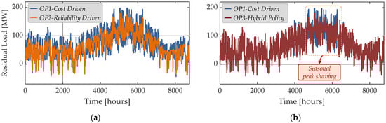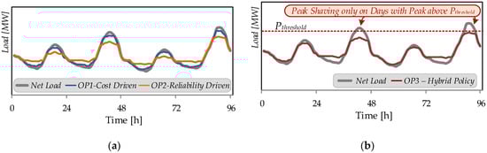 - OP3—Hybrid policy: peak shaving is prioritized only on high demand days, while a cost-driven approach is adopted for the rest of the year.