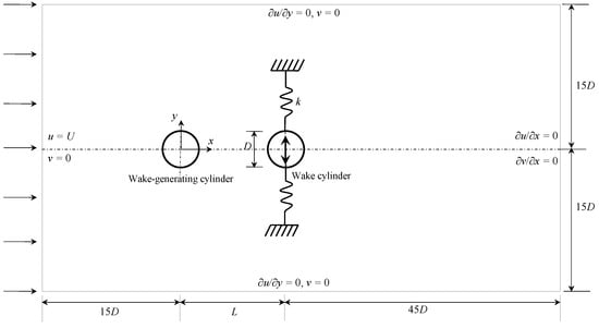 The flow is given in a rectangular computational domain where two circular cylinders are arranged in tandem at the horizontal centerline of the domain (Figure 1). The wake-generating cylinder is fixed, and the wake cylinder is spring-mounted. The latter cylinder is allowed to oscillate in the transverse direction only. The total spring stiffness is k. The Cartesian coordinate system (xy) has its origin at the center of the wake-generating cylinder. The inlet and outlet boundaries of the computational domain are placed at x = −15 D and L + 45 D, respectively, where L is the distance between the centers of the cylinders, and D is the diameter. The upper and lower boundaries are symmetrically separated by 30 D from each other [17,18]. The corresponding cylinder blockage ratio is 3.3% [19].