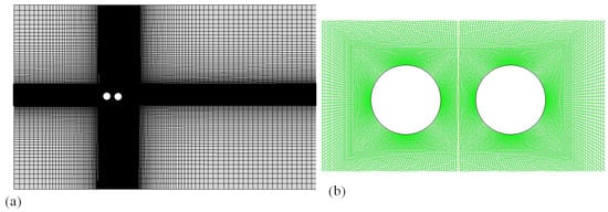 Figure 2. (a) Grid system in the computational domain and (b) close-up view of grids around the cylinders. L/D = 1.5.