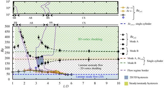 Figure 3. Marginal flow map (colored background) and flow regimes bordered by purple lines for two tandem circular cylinders. SB, slender/extended-body flow; AR, alternate reattachment flow; HS, hysteresis zone; BS, bi-stable flow; CS, co-shedding flow. Reproduced from Rastan and Alam [22]. For the definitions of the legends, please refer to Rastan and Alam [22]. Recr1 represents the flow transition from steady to two-dimensional unsteady while Recr2 indicates the flow transition from two-dimensional unsteady to three-dimensional unsteady.