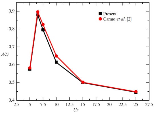 Figure 4. Validation of wake-cylinder vibration amplitude A/D plotted against reduced velocity Ur. L/D = 3, m* = 2, ζ = 0.003, and Re = 150.