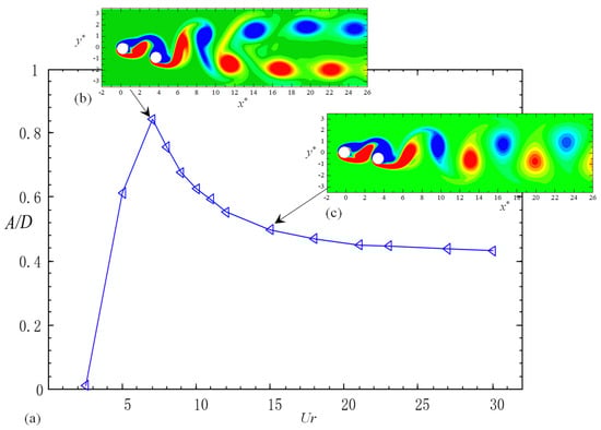 Figure 5. (a) Variation in vibration amplitude A/D with reduced velocity Ur. Vorticity structures for (b) Ur = 7 and (c) Ur = 15. L/D = 3, m* = 2, and ζ = 0.005.