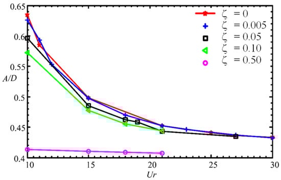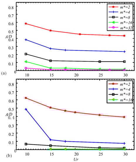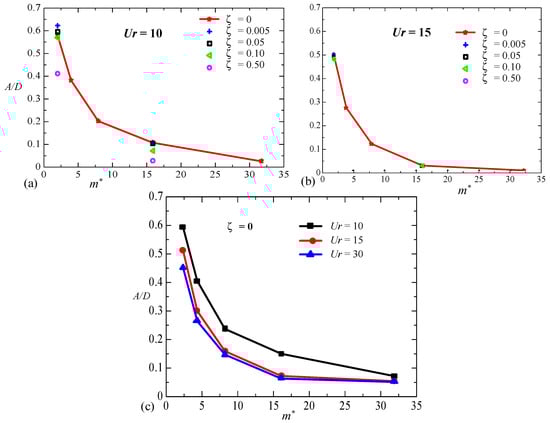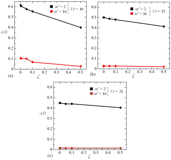 Figure 7 answers the above-mentioned two questions where A/D is presented against ζ for m* = 2 and 16 in the case of Ur = 10, 15 and 21. As seen in the figure, an increase in ζ causes a reduction in A/D for both m* = 2 and 16 with Ur = 10 (Figure 7a). The reduction is, however, large at small m*, the gradient (d(A/D)/dζ) in the range of ζ = 0–0.5 being −0.42 and −0.15 for m* = 2 and 16, respectively. When m* is increased from 2 to 16, dramatic reductions in A/D occur for all ζ values (Figure 7a). Although a similar observation is made for Ur = 15 (Figure 7b), the gradient magnitude is smaller for Ur = 15 than for Ur = 10. The A/D becomes almost insensitive to ζ for Ur = 21. Overall, the effect of ζ on A/D is large at small m* and small Ur. The m* effect on A/D is significant for all ζ values, albeit larger at a smaller ζ. Given that the ζ values of engineering structures appear less than 0.1 and the m* may vary up to the order of 3 [32,33,34,35], it can be said the effect of m* on A/D is much more than that of ζ.