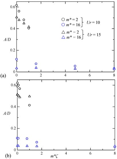 In the previous section, both m* and ζ causes a reduction in A/D. For a single isolated cylinder, mass-damping ratio (m*ζ) has been proven to be another characteristic parameter that has a connection with A/D [36]. The A/D is found to monotonically decrease with increasing m*ζ for a single isolated cylinder [37]. To see the relationship between A/D and m*ζ for the cylinder interacting with the wake, A/D is plotted against m*ζ in Figure 10 for Ur = 10 and 15. For these data, ζ varies from 0 to 0.5 for both m* = 2 and 16 (see the legends in the figure). Interestingly, although A/D decreases with increasing m*ζ for a given m*, the decrease rate is contingent on m*, high at small m*, and vice versa. The A/D data fail to collapse onto a single line against m*ζ, which suggests that m*ζ is not a unique parameter to characterize the vibration for a cylinder interacting with the wake of another cylinder.