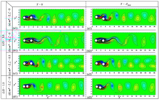 It is worth investigating how the wake structure is modified when L/D, m*, and ζ are changed. Figure 11 shows vorticity structures for L/D = 3.0 and 1.5 for different values of m* and ζ. The first- and second-column snapshots correspond to Y ≈ 0 (i.e., mean position) and YYmax (i.e., maximum displacement), respectively. In the first- and second-row wake structures (Figure 11a,b), the effect of increasing m* from 2 to 16 on the wake structure is displayed. For m* = 2 and ζ = 0 with L/D = 3.0 (Figure 11a), the wake behind the wake cylinder is characterized by 2S mode (i.e., two vortices shed in one oscillation cycle). The shear layers emanating from the wake-generating cylinders roll up into the gap between the cylinders. When the vibrating cylinder is close to the mean position (Y ≈ 0), the vortices from the wake-generating cylinder impinge on the vibrating cylinder. On the other hand, they both pass over the same side of the vibrating cylinder when the vibrating cylinder is at its maximum displacement (YYmax). When the m* is increased to 16 (Figure 11b), the shear layers from the wake-generating cylinder do not roll up in the gap between the cylinders but alternately reattach on the vibrating cylinder. Another remarkable difference in the wake structures between m* = 2 and 16 (Figure 11a,b) is that a greater number of vortices appear in the same downstream distance (x* = 4–26) for m* = 2 than for m* = 16. Given the 2S mode for both cases, it can be argued that the cylinder oscillation frequency reduces when m* is increased from 2 to 16, which is consistent with our intuition.