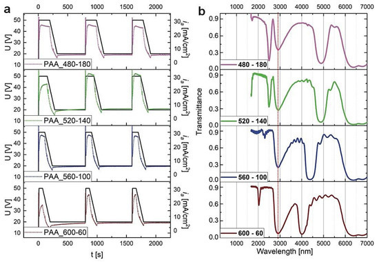 Four PAA-based DBRs were produced under the time-controlled mode, where the duration of UH and UL pulses was varying while maintaining the tH + tL = 660 s. In Figure 4, the U(t) and ia(t) curves for the first three cycles and the corresponding transmission spectra of the PAAtL–tH samples (after tp = 60 min) are shown. First of all, it can be noted that the λ1 peaks in the MIR spectral range (>3000 nm) are very symmetrical and intensive (transmittance at the center of the λ1 is close to zero). Moreover, a simultaneous increase of the tL and decrease of the tH by 40 s makes the λ1 band to shift from ca. 5000 nm to 4000 nm.