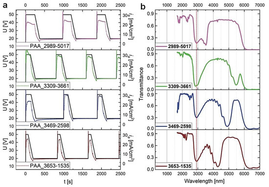 In Figure 5, the U(t) and ia(t) curves for the first three cycles recorded during pulse anodization under the charge density-controlled mode and the corresponding transmission spectra of the PAA_CL-CH samples (after tp = 60 min) are shown. It can be seen that upon switching the modes the λ1 peaks in the MIR spectral range became broader and asymmetric (blue edge of the peaks is split). Furthermore, the center position of the λ1 bands are red-shifted with respect to the corresponding peaks recorded for the PAA_tL–tH samples. In the transmittance spectrum of the sample PAA_2989-5017 the λ1 peak is presumably shifted above 6000 nm and thus is not visible, whereas the peak at around 3500 nm is the second order the PSB (λ2).