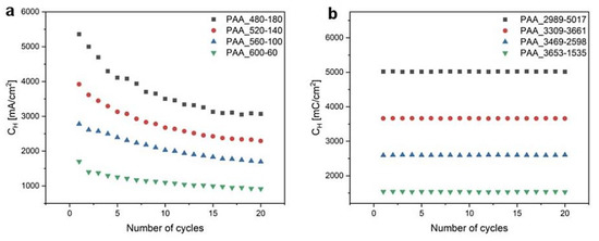 CH as a function of the number of cycles determined for (a) time- and (b) charge density-controlled mode pulse anodization.
