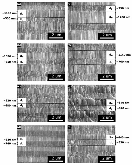 SEM images of upper dH and dL segments in the PAA_tL-tH DBRs: (a) PAA_480-180, (b) PAA_520-140, (c) PAA_560-100, (d) PAA_600-60; and in the PAA_CL-CH DBRs: (e) PAA_2989-5017, (f) PAA_3309-3661, (g) PAA_3469-2598, (h) PAA_3653-1535.