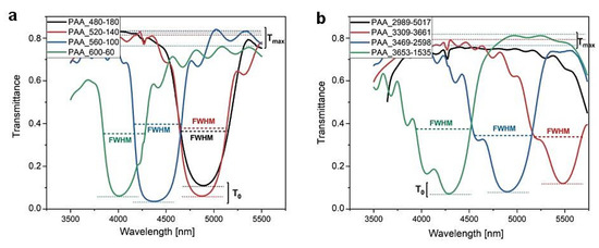 The bandwidth of the PSB depends mainly on the ∆n: the larger the refractive index contrast, the larger the FWHM [34,35]. The ∆n in PAA-based DBR is determined by the contrast in porosity of the dH and dL layers. The porosity, in turn, depends fully on the anodization parameters such as the applied anodizing voltage and temperature, which define both the interpore distance (Dc) and the pore diameter (Dp). Since the PAA-based DBRs were all produced under the same pulse sequence (UH = 50 V, UL = 20 V) and anodizing temperature, the porosity of the dH and dL segments ( [25]) and thus the nH and nL (∆n = (nL2 − nH2)/2nL2 = constant) should not vary. In Table 2, the spectral position of the λ1 and λ2 bands extracted from the simulated spectra are gathered. The optical spectra were simulated taking into account the thickness of the upper dH and dL pairs (Figure 7) and assuming the same ∆n = 0.06 for all samples. As can be seen, both bands are in a good agreement with the observed ones (Figure 4b, Figure 5b and Figure 8). The simulation also confirms that the peak at around 3500 nm in the spectrum of the sample PAA_2989-5017 comes from the λ2. The small discrepancies between the observed and calculated λ1 and λ2 bands as well as the variable PSB broadening can result from the different pulses’ duration and thus the entire process. The longer anodization time will cause a larger pore broadening (larger Dp) and larger the dH and dL layers’ porosity and, as a consequence, the nH and nL will change. The ∆n can be also slightly affected by the Al2O3 refractive index variation itself with the wavelength (the n of Al2O3 is decreasing from 1.67 to 1.62 when the wavelength is increasing from 4 to 5 μm [36]). Owing to the same number of pairs in all studied multilayer stacks, the λ1 intensity (T0) are comparable in both type of samples. A minor difference in T0 is due to the probable slight variation of the ∆n in the real samples.
