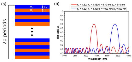 A scheme of the PAA-based DBR (a); the reflectance spectra of two DBR structures with the same number of dH + dL pairs (20 periods), ∆n = 0.06 and different optical thickness d neff (b).