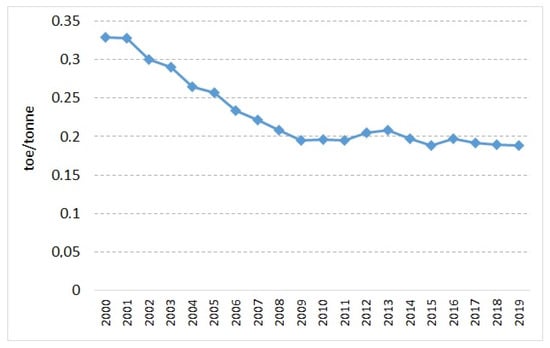 In the analysed period from 2000 to 2019, the energy consumption per 1 tonne of steel dropped from over 0.3 toe to 0.19 toe. The data are presented in Figure 2. The trend of energy consumption showed a strong decrease until 2009 (a decrease by 0.13 toe/tonne of steel in 2009 compared to 2000). The year 2009 was marked by a decrease in production (Figure 3) as a result of the global financial crisis. After 2009, the average annual energy consumption per 1 tonne of steel produced was 0.19333 toe.