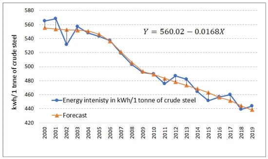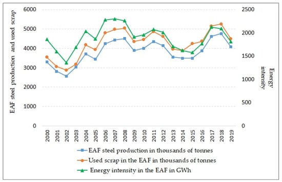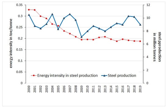 With the growing pace of globalisation, international competitiveness requires companies to place more emphasis on reducing their production costs, including those related to energy []. “Energy intensity” is one of the most frequently used terms in relation to the effectiveness of business performance. This is mostly because energy is a key production factor in many industries []. One study estimates that approximately 80% of energy is consumed by steel and chemical producers []. These data clearly show the need to increase efforts to reduce energy intensity and to increase transparency, regardless of the industry []. Energy intensity is measured by the utilisation of different metrics. Basically, the choice of a particular approach depends on two factors: (1) availability of the data, and (2) the purpose of the study []. One of these approaches is used if one wants to present the performance of particular companies (or sectors). In other words, the higher the energy consumption, the higher the energy intensity. Given this fact, it is of pivotal interest for companies to concern themselves with energy efficiency. On the one hand, energy efficiency belongs to the key measures required to diminish both CO2 emissions and energy consumption [] and, on the other hand, energy efficiency has a direct impact on production costs. Therefore, a reduction in energy intensity is proof of efficiency improvement. Energy intensity is connected with the volume of steel production.