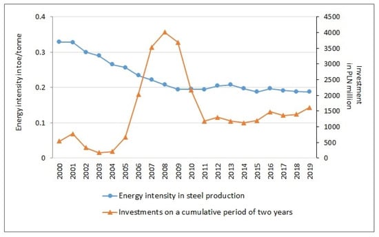 Energy intensity and investments in the Polish steel industry in 2000–2019. Source: own analysis based on [].