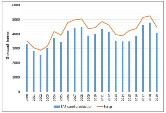 EAF technology is characterised by low direct emissions but high energy consumption. In Poland (due to the low share of energy produced from renewable raw materials), the energy consumption of steel mills is very high. According to the Central Statistical Office (Statistics Poland), there are three industries in the group of high energy consumption in the Polish processing industry: metallurgical, chemical and mineral. The share of energy consumption of these three highly energy-intensive industries in domestic industry is presented in Table 1 (energy consumption in 2000 was compared with energy consumption in 2018, as there was no data for 2019).