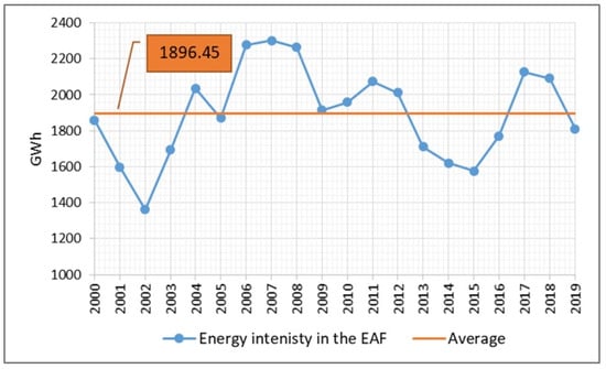Energy intensity directly influences production costs and, thus, competitiveness of steel companies. The impact of investments on energy intensity in the steel industry is stretched over time. For example, Wolniak et al. show in their study that the more investments steel plants make, the more energy intensity decreases []. The same conclusions were reached by Gajdzik and Sroka in previous studies []. Gajdzik shows that in the period from 2000 to 2019, energy intensity was 0.2320 toe/tonne of steel. The energy intensity in Poland during the analysis period was lower than the average energy intensity in the EU. The average energy consumption in the EU was 0.3120 toe/tonne []. Wolniak et al. analysed the model of energy intensity in Polish steel industry for all technological processes. The correlation analyses carried out show the delay of the impact of technological investments on the reduction of energy intensity per 1 tonne of steel. In their model, an increase in investment by PLN 1 million (ca. 220 thousand Euro) causes the reduction in energy consumption per 1 tonne of steel by 0.0000357 toe/t. []. One should add that, in Poland, steel is manufactured in electric furnaces and converters. The average annual steel production in Poland in 2000–2019 amounted to 9.13 million tonnes. Since 2003, only two steel production technologies have been used in Poland: EAF and BOF. The third technology of steel smelting in open-hearth furnaces (Martins’) has been withdrawn for economic and environmental reasons. The share of this technology in the total steel production in Poland in the last years before its withdrawal was low. In 2000, the share of open-hearth steel in the total of steel produced in Poland was 3.8%, the production dropped to 2.3% in 2001, and in the last year of using open-hearth furnaces, only 1.2% of crude steel was produced using this method. Due to the small share of open-hearth technology in the total of steel production in Poland in 2000–2002, it was not included in our analysis.