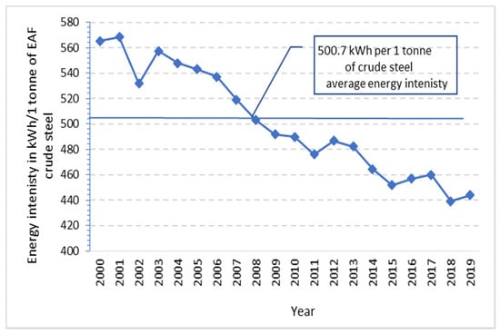 Because the main raw material in EAF process is electricity, investments towards production efficiency also lead to a reduction in energy consumption. The final conclusion, which is the reference to the research hypothesis (H1), is that there is a relationship between the volume of steel production utilising the EAF process and the energy consumption of the process, which is influenced by investments. The correlation is negative, i.e., along with the increase in technological investments in electric steel plants in Poland, a decrease in the energy consumption of steel produced in electric furnaces was noted in the analysed period (2000–2019). Our findings are in line with the results of Arens et al. (2012) [], who stated that energy consumption per tonne of crude steel in the German steel industry decreased by 6.3%, 4.6% of which occurred between 1994 and 2007. This decrease in energy consumption per tonne of crude steel originates from an increase in the share of EAF production. In a broader perspective, our research confirms the findings of Kim and Worrell (2002) [], who stated that investments made in developing countries have led to increased energy efficiency in Korea, China, Brazil, Mexico and India. The same results were observed in China. According to the report of the National Bureau of Statistics of China (2018) [], investments in the production capacities of steel plants had a positive impact on the energy efficiency in the said sector, as the energy intensity decreased by 11.5% in the period between 2006 to 2017 (the report does not differentiate the energy intensity among the technologies applied by the particular companies). On the way to saving energy, steel mills will retain the concept of sustainability, which is a key strategy for industries with a strong environmental impact. Even in new technological trends, the concept of sustainability remains relevant in industrial companies [].
