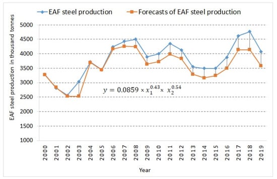 For the purposes of this study, the model of an inverse relationship was analysed, i.e., the impact on the volume of steel production utilising the EAF (Y) (thousand tonnes) process and the consumption of the input material—scrap (X1) (tonnes) and energy consumption (X2) (GWh). The obtained power two-factor model of the form: