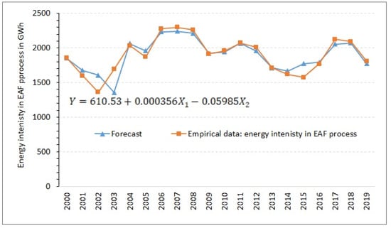 The model describes the dependence of electricity consumption in electric furnaces (Y) (GWh) on the consumption of steel scrap in electric furnaces (X1) (tonnes) and investments in enterprises with an electric furnace (cumulatively) (X2) (million PLN). The model is well fitted, the R2 coefficient was 0.804, which means that 80.4% of the Y variation is explained, the fit is very good (R2d = 0.897), and the Se coefficient = 0.0063. On the basis of the significance test of the parameters (statistics—t), the following was obtained: X1: t = 58.32 for p < 0.99 (parameter X1 is significant); X2: t = −4.31 for p < 0.99 (parameter X2 is significant). Figure 10 shows the trend of empirical data and the trend of the ex-post forecast obtained on the basis of model (2). The trend of the ex-post forecast reflects the empirical data well (greater deviations of the model from the empirical data were recorded for 2003 and 2015).