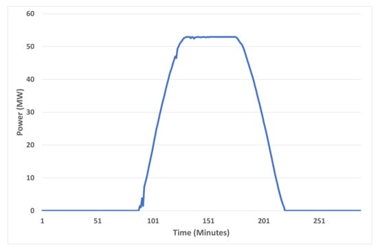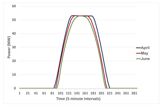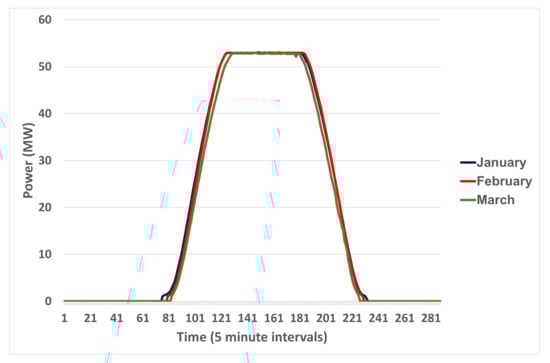 It is imperative to note that for solar farms in Australia in particular, the seasonality in most instances is different from the seasonality in solar radiation. On a clear day, the solar radiation profile has a distinct peak—See Figure 3. However, in most installations in Australia, the field is oversized compared to the capacity of the inverters. This results in the output displaying a flat maximum over a number of hours on a clear day in summer as in Figure 4, or a smaller number of hours in winter as in Figure 5.