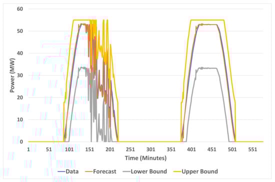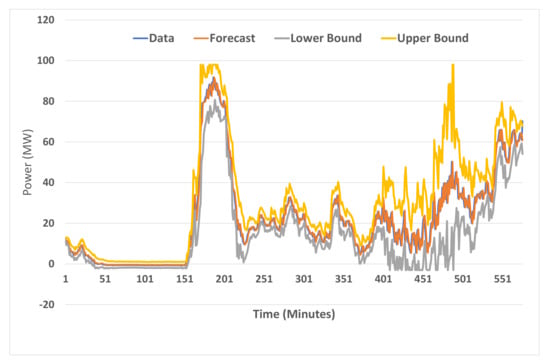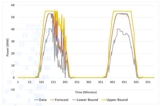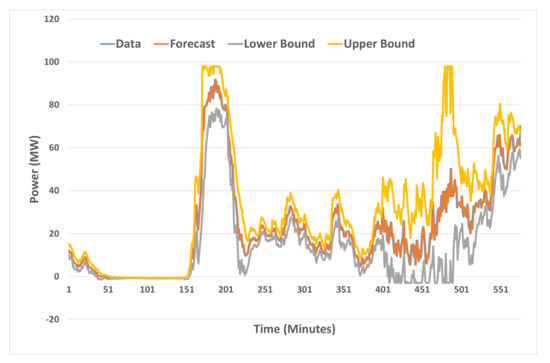 Specifically, in [], the authors use an ensemble of various activation functions in ANNs to create the prediction intervals. It is applied to datasets obtained from a lab-scale DC micro-grid system for testing. In [], the systematic change in distribution of the noise terms of the forecasting model is utilised to construct the prediction intervals. This systematic change reflects the fact that the distribution of solar radiation is dependent on the time of day and time of year. For example, the distribution has a higher variance and skewness in the middle of the day in summer than at any other time. In [], the authors exploit both this systematic change in variance, as well as the conditional change in variance to construct the prediction intervals. The conditional change in variance is typical of a series displaying the ARCH effect, the autoregressive conditional heteroscedastic or variance clustering effect. Periods of high volatility are interspersed with periods of low volatility. The authors of [] use quantile regression and picking the error distribution to work with based on bins for the errors for varying levels of point forecasts. This is perhaps the most comprehensive of the present methods. Ensemble forecasting of clear sky index followed by post processing of the raw forecasts was used in []. Reforecasting using ANN methods is utilised in [] to improve the skill of three methods, physical based on cloud movement, ARMA and k nearest neighbour approaches. Seeing that the physical model is probably for forecasting solar radiation, we assume that the others are too. Presumably we can infer from this that an indirect method whereby radiation is forecast and then the plant power output is modelled from that needs further enhancement. From the inspection of the literature it would appear that for solar power, the article of [] stands out in that they forecast the power output by using the history of power output. In [], ARMA and generalised autoregressive conditional heteroscedastic (GARCH) models are used to construct prediction intervals for solar radiation. They do not take into account the systematic change in variance that is evident in [,]. There are several other articles we could refer to here but we would like to simply point to [], where the authors use a deep convolutional neural net for their forecasting. We want to point out that while this approach is very useful, we choose to take a simple tool where we can utilise the physical and statistical attributes of the output to build our prediction intervals. One very valuable review article is [], where the authors describe in some detail a vast array of tools from the simple ARIMA type to ANNs to sophisticated machine learning tools.