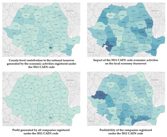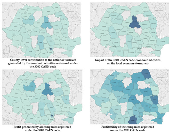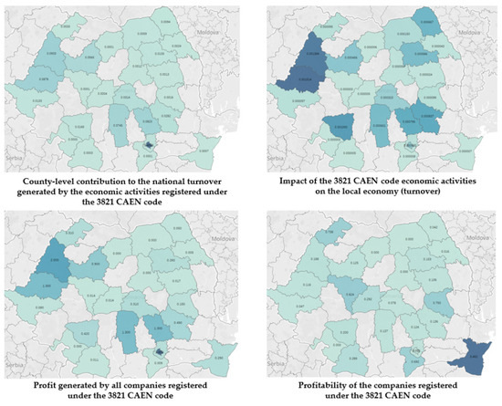 With respect to the analyzed business activities, multiple economic performance indicators (see Table 2) were calculated at county-level and results are visually represented in Figure 1, Figure 2, Figure 3 and Figure 4.