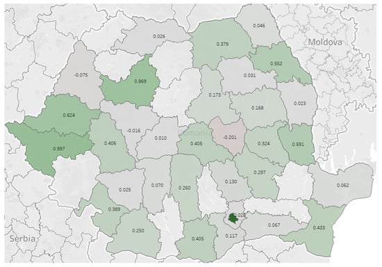 It is worthwhile to study the waste sector in detail while examining the energy-waste-water nexus. As a result, the Romanian waste sector was examined via the economic prism of business activity code 3821, which stands for treatment and disposal of non-hazardous waste. As illustrated in Figure 2, 26 counties have seen an increase in the number of businesses dedicated to the treatment and disposal of non-hazardous waste.