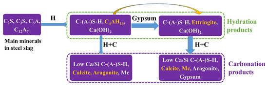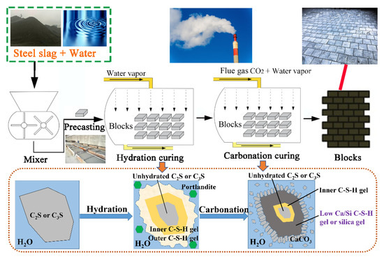 Steel slag (SS), produced during the steel manufacturing process, is considered an ideal feedstock for CO2 sequestration owing to its high carbon reactivity, high CaO content (30–60%), and high output (more than 100 million tons per year in China) [10,11,12,13,14,15,16]. However, the current utilization rate of SS in China is only 29.5% [3,17], and its stockpiled amount reached 1.8 billion tons at the end of 2018 in China. Based on previous studies on the carbonation of SS, dicalcium silicates (C2S) and tricalcium silicates (C3S) are the most important components to undergo the reaction in SS. The C2S and C3S can react with H2O to form calcium–silicate–hydrate (C-S-H gel) (Figure 1). Therefore, SS is sometimes used as a cementitious material [4]. However, SS has a lower hydration reactivity than the cement due to its larger particle size and more stable crystal structure resulting from its slow cooling rate during the production process. In addition, the presence of free lime (f-CaO) and magnesium oxide (f-MgO) in SS may result in volume instability [17,18]. Many studies have shown that hydration–carbonation-cured SS samples have greater compressive strength performance and CO2 capture capabilities than do purely hydration-cured SS samples [5,19,20,21]. CaCO3 tends to precipitate from the carbonation of C-S-H gel and portlandite (Figure 1), and the carbonation of free oxides improves volume stability [13,14]. Therefore, using metallurgical industrial flue gas to cure SS and produce building materials (Figure 1) is an excellent way to consume SS, absorb CO2, and reduce cement production.