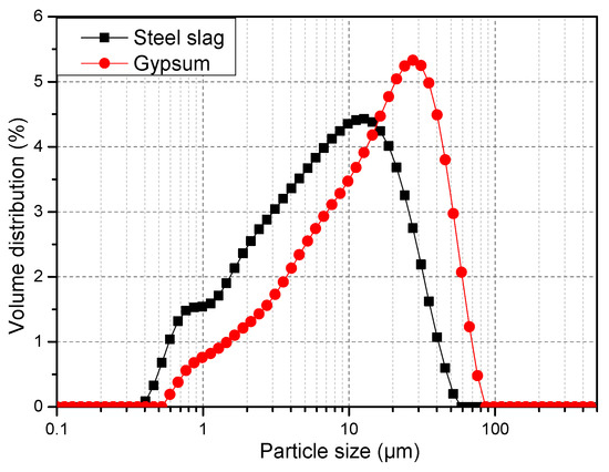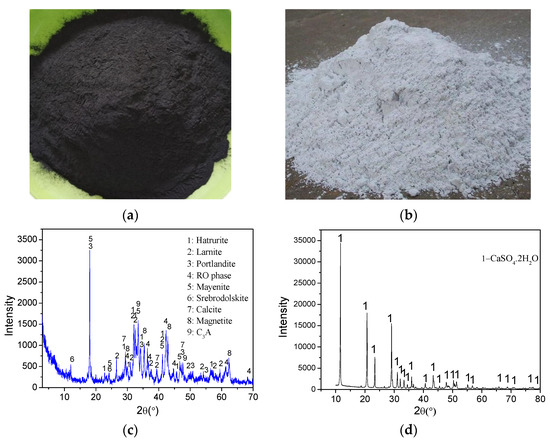 The SS used in this study, with a specific surface area of 460 m2/kg, was obtained from Anshan Iron and Steel Co. Ltd., Anshan, China. DG was provided by Jintaicheng Environmental Resources Co., Ltd. (Baoding, China). X-ray fluorescence and carbon/sulfur analyses were used to determine the chemical compositions of the SS and DG. The Mineral compositions of the samples and raw materials were characterized using a Rigaku UltimaIV X-ray diffractometer with CuKα radiation (40 kV, 40 mA). Data were collected from 3 to 70° (2θ) in the step-scanning mode (FT1.5s) with a step size of 0.02°. Furthermore, the Rietveld refinement was conducted using TOPAS software (ver. 5.0, Bruker AXS GmbH) for quantitative X-ray diffraction (QXRD) analysis on the SS. It should be noted that the QXRD results are related barely to the crystalline components of the sample. Table 1 shows the chemical and mineral compositions of the SS and DG. Figure 2 indicates images and the XRD pattern for the SS and DG. The crystalline phases of the SS mainly contain larnite (Ca2SiO5), hatrurite (Ca3SiO5), mayenite (Ca12Al14O33), portlandite (Ca(OH)2), RO phase (solid solution of CaO, MgO, FeO, and MnO) [10,23,24], calcite (CaCO3), srebrodolskite (Ca2Fe2O5), magnetite (Fe3O4), and C3A (Ca3AlO6). The DG used in this study, with the main component of DG (CaSO4·2H2O), is a by-product of the steel manufacturing process. Figure 3 shows the particle size distributions (PSDs) of the SS and DG, showing that the Dv(50) values of the SS and DG were 7.52 and 16.5 μm, respectively.