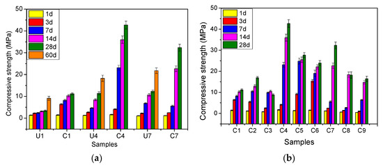Figure 4 shows that compressive strength of pastes U1, U4, and U7 increase with the curing duration. From MIP results of U4 (Figure 10a,b), hydration curing promoted the transition from large pores to micropores and reinforced the densification of the microstructure, mainly resulting from the intertwining of C-S-H gel and ettringite or C4AH13. DTG (Figure 9) results are in great line with the existence of these hydration products. Their increasing amount with hydration curing ages were also verified by the QXRD results (Figure 7). In a word, the intertwining of the increasing hydration products and decreasing pore volumes contributed to increases in density and strength.