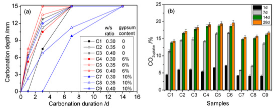 Additionally, the carbonation depth and CO2 uptake of the samples increased with the carbonation curing age (Figure 5). All of the samples reached a maximum carbonation depth of 15 mm at 14-days curing (Figure 5a), which is in line with the fact that the CO2 uptakes of the 14-days cured samples were close to those of the 28-days cured samples (Figure 5b), indicating that the carbonation reaction was nearly complete within 14 days. Similar to the strength results, samples with a DG addition of 6% (C4–C6) showed the highest CO2 uptake and greatest carbonation depths. However, a 10% DG addition had negative effects on strength, carbonation depth, and CO2 uptake. Furthermore, samples with a higher w/s ratio showed relatively high CO2 uptake and carbonation depths.