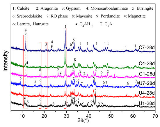 Figure 4 shows the significant influence of carbonation in promoting UCS. The reason for the increase in large pores after carbonation curing may be that the hydration products in U1 and U4 (mostly C-S-H gel, C4AH13, and/or ettringite) had high carbon reactivity and were readily consumed in the carbonation environment. The C-S-H gel is prone to reaction with CO2 to form calcite and low-Ca/Si C-S-H gel or silica gel. In this process, the C-S-H gel loses much water and its structure is broken up to some extent, producing large pores.