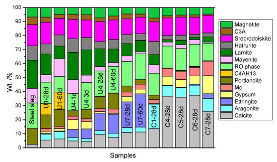 The XRD patterns in Figure 6 show the mineral components of U1, U4, U7, C1, C4, and C7 on Day 28. Since the main peaks of DG and monocarboaluminate overlap in the XRD pattern, retrieved QXRD was used to determine their amounts in the samples. QXRD analysis results for some of the samples can be seen in Figure S1 in Supplementary Material. Figure 7 shows the outcome of QXRD analysis using the Rietveld refinement method. Based on qualitative and quantitative XRD analysis results, it is evident that the amounts of some relatively stable minerals in the SS, such as srebrodolskite (C2F), magnetite (Fe3O4), and the RO phase, remained almost stable during hydration and carbonation curing. However, the percentages of larnite (C2S), hatrurite (C3S), portlandite (Ca(OH)2), tricalcium aluminate (C3A), and mayenite (C12A7) decreased over time, indicating the high reactivity of these minerals. The main hydration crystal products in the hydrated SS (U1) were C4AH13 and portlandite. It is commonly known in the cement field that C-(A-)S-H gel is a common hydration product. However, it is amorphous and cannot be determined via the XRD analysis. The main carbonation products of the samples without DG addition were calcite and aragonite (C1-28d). Based on a comparison of the U4 and U1 samples, the addition of DG clearly promoted the formation of ettringite (C3A·3CaSO4·32H2O) during the hydration reaction, whereas ettringite almost disappeared after 28 days of accelerated carbonation. Accordingly, calcite, aragonite, and monocarboaluminate (C3A·CaCO3·11H2O) became the main products after carbonation curing. DG may have stimulated the reactivity of C3A and mayenite. The aforementioned XRD results explain why the C4-28d sample exhibited more CO2 uptake than did the C1-28d sample (Figure 5).