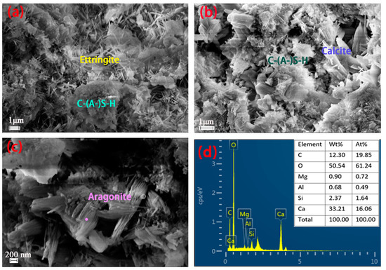Figure 8 shows the SEM-EDS results for the hydrated and carbonated samples. Large amounts of ettringite and C-(A-)S-H gel can be easily seen in the U4-28 d sample (Figure 8a). These two components are reported to be the main supports for cement strength gain via their intertwining within the material. SS has similar minerals to cement but has much lower strength owing to the lower reaction activation and lower content of active minerals in SS (resulting from differences in the resource and production processes vs. cement). Figure 8b reveals the main carbonation products, i.e., low-Ca/Si C-(A-)S-H gel and calcite. Calcite is the main carbonation product and was precipitated across all of the samples, which is in line with the XRD results. The carbonated C-(A-)S-H gel was looser than was observed prior to carbonation since the Ca in the gel became separated out and carbonated into calcite. The 28-days carbonation-cured C1 sample showed the formation of sheaf-like aragonite (Figure 8c,d) [25].