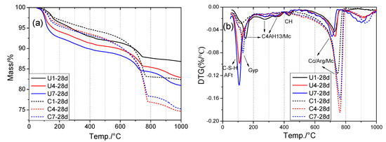 The strengths of U4 and U7 tended to be greater than that of U1, especially in the later stages, indicating the positive effect of DG on the hydration-curing sample strength (Figure 4). Figure 10c,d indicatess that DG promoted the densification of the hydration system. In terms of the chemical reaction, gypsum may have reacted with C3A and mayenite (C12A7) in the SS to form ettringite (XRD results; Figure 6 and Figure 7), which intertwined with the C-S-H gels to produce a more stable structure and smaller pores (SEM image; Figure 8a). The TG results (Figure 9) also indicate many more hydration products (C-S-H gel and ettringite) in U4 and U7 than in U1. This is consistent with the 28-days UCS results in Figure 4, in which the UCS of U1-28d, U4-28d, and U7-28d were 3.38, 11.39, and 12.25 MPa, respectively.