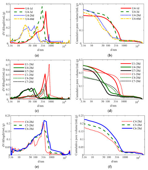 PSD curves and cumulative pore volume curves of the hydration-cured and carbonation-cured samples; (a,b): U4 at different curing ages; (c,d): U1, U4, U7, C1, C4, and C7 at 28 days; (e,f): C4, C5, and C6 at 28 days.