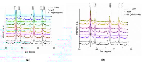 The coherent scattering region (CSR) was calculated by the Selyakov–Scherrer method from the broadening of the diffraction peak 1.1.1 assigned to phases having a cubic structure of the fluorite type; CSR (NiO)–peak 2.0.0 NiO phases; CSR (Ni)–peak 2.0.0 phases of Ni°. The average crystallite size of CeO2-based solid solution is equal to 8.0 nm, and it is the same for all samples. Thus, the phase composition of the support and its structural characteristics do not change as a result of the introduction of Ni or Ni-M active component (Table 1). The average crystallite size of the NiO phase is slightly smaller for Ni, Ni-Pd, and Ni-Rt catalysts in comparison to Ni-Pt and Ni-Re samples (16.5 vs. 19.0 nm), which indicates some effect of the second metal. The diffraction patterns of the Ni-M samples show no peaks related to the corresponding M-containing phases because of the low content of M (less than 1 wt.%) and its high-dispersed state (Figure 3).