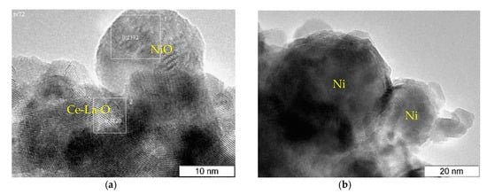 TEM data (Figure 4) confirms the XRD study results. On the surface of CeO2-based solid solution with crystallite size no greater than 10 nm, NiO particles of 10–20 nm in size were observed.