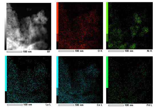 In the case of catalyst Ni-Pd-0.012 (C), we studied the local distribution of constituent elements using the EDX analysis. Figure 5 shows a HAADF-STEM image of the fresh Ni-Pd-0.012 (C) catalyst with the corresponding EDX maps. It was seen that Ce and La had almost homogeneous distribution in the studied region, which confirmed the formation of a solid CexLa1-xO2 solution. The opposite situation was observed for nickel: areas with an increased nickel concentration were well seen, which indicated the formation of its separate phase. It agreed well with the XRD data (Table 1). The palladium distribution map did not contain any areas of high concentration. This indicates the absence of individual palladium-containing nanoparticles in the studied area. However, due to the low palladium content, the PdL signal is very weak. Thus, the obtained data do not allow us to conclude whether palladium is located predominantly in the composition of Ni-rich particles or is localized on the surface of the fluorite phase.