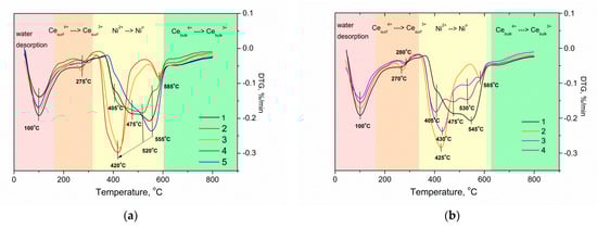 For Ni catalyst in a low-temperature region (T < 150 °C), an endothermic effect at TDTA= 125 °C is observed. It is accompanied by a weight loss (−∆m/m = 2.5%) through water desorption. In the temperature range 150–350 °C, there are two endothermic effects at TDTA = 200 and 325 °C. The weight losses of 7.8 and 7.6% were connected with the decomposition of nitrate nickel hydrate to anhydrous Ni(NO3)2 and then transformation of Ni(NO3)2 to oxide NiO, correspondingly [61]. At a temperature of 450–900 °C, the change in the weight of the sample is apparently associated with dehydroxylation of the support surface. The total weight loss is equal to 17.4%. Similar behavior was observed for all other Ni-M/Ce0.8La0.2O1.9 catalysts. As an example, on the derivatogram of the Ni-Pt/Ce0.8La0.2O1.9 sample, there are no effects corresponding to the decomposition of the Pt precursor due to its low content (Figure 1b).